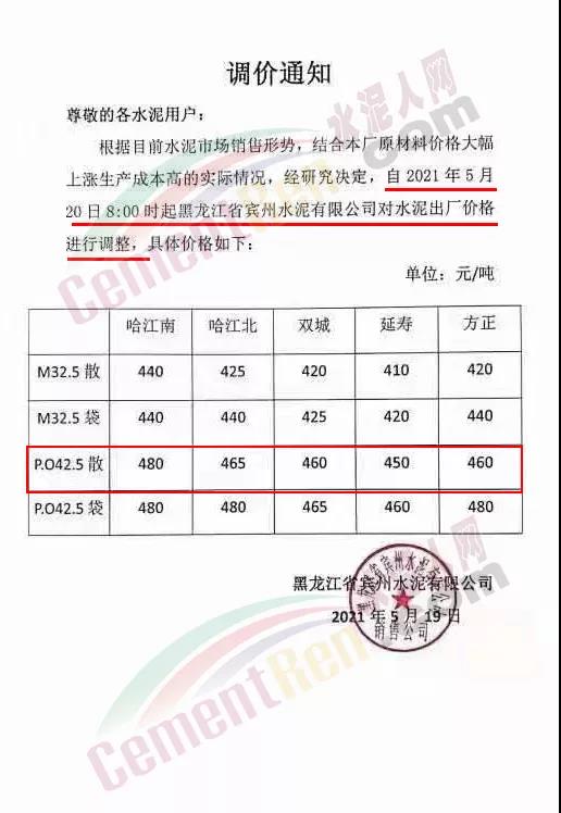 黑龍江賓州水泥有限公司通知,自5月20日8時(shí)起執(zhí)行最新價(jià)格,PO42.5散裝水泥各區(qū)域報(bào)價(jià)450~480元/噸。
