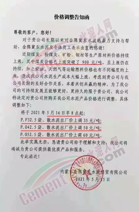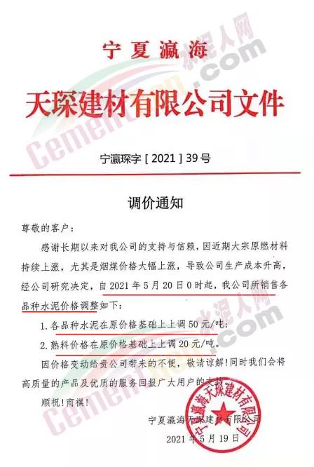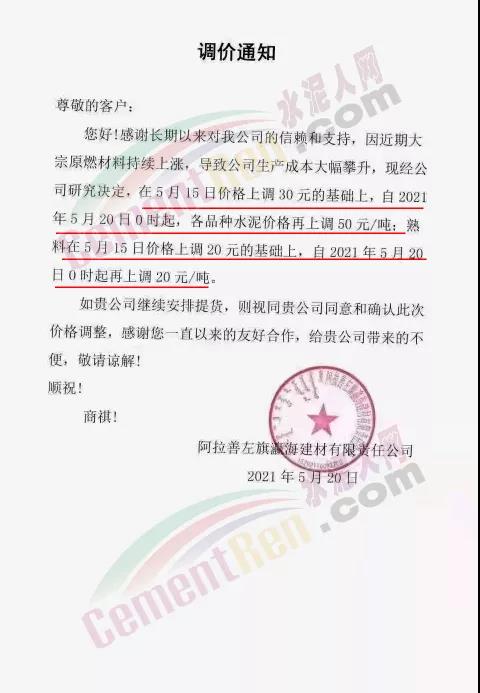 阿拉善左旗瀛海建材有限責(zé)任公司、寧夏瀛海天琛建材通知,因近期大宗原燃材料持續(xù)上漲,導(dǎo)致公司生產(chǎn)成本大幅攀升,經(jīng)公司研究決定,在5月15日上調(diào)水泥和熟料價(jià)格30元/噸、20元/噸基礎(chǔ)上再次上調(diào)50元/噸、20元/噸。兩次累計(jì)水泥上調(diào)80元/噸,熟料上調(diào)40元/噸。