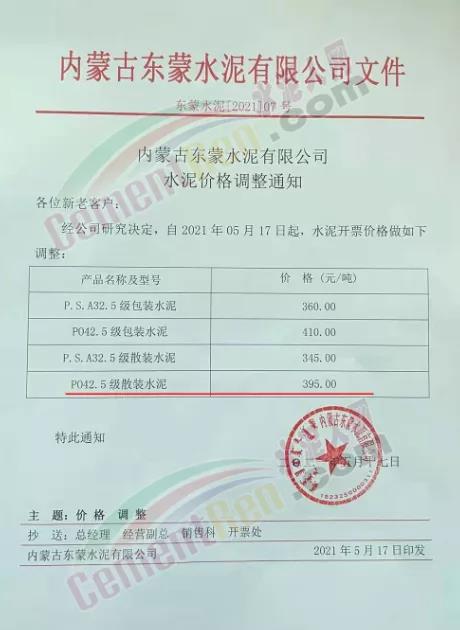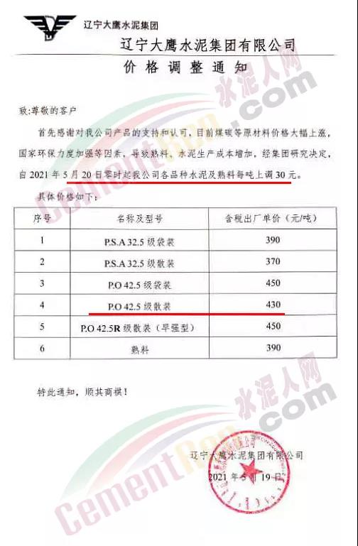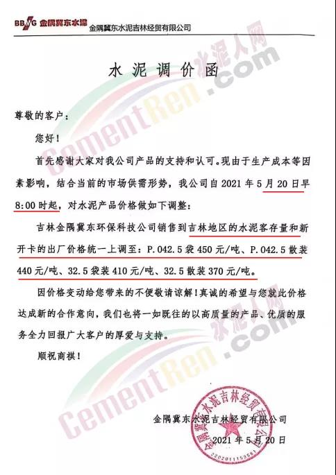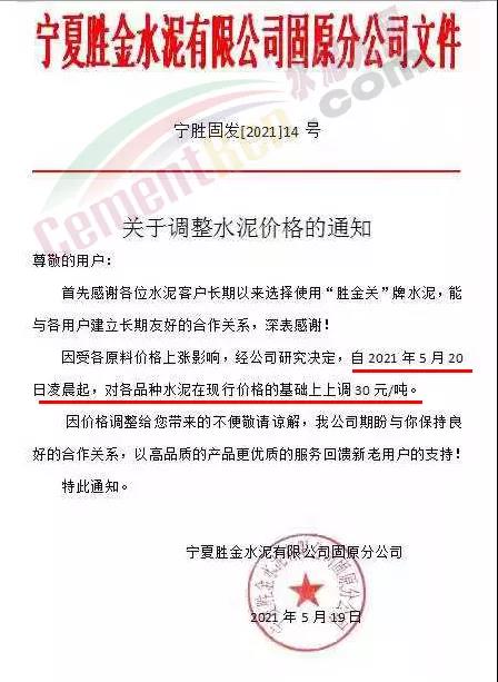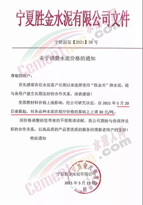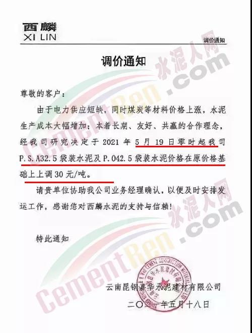 四川瀘定山盛水泥有限公司通知,因近期原燃材料持續(xù)上漲和國家環(huán)保政策的加強(qiáng),經(jīng)公司研究決定,于 2021年5月23日零時(shí)起,對(duì)銷往甘孜州區(qū)域所有品種水泥在原來價(jià)格的基礎(chǔ)上上調(diào) 30 元/噸。