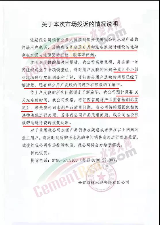 公司承諾:待江西省建材產(chǎn)品監(jiān)督檢測站鑒定后,若是分宜海螺水泥產(chǎn)品質(zhì)量問題,企業(yè)將按照國家相關(guān)法律法規(guī)進(jìn)行處理;若非企業(yè)產(chǎn)品質(zhì)量問題,分宜海螺也會積極幫助進(jìn)行瓷磚恢復(fù)處理。