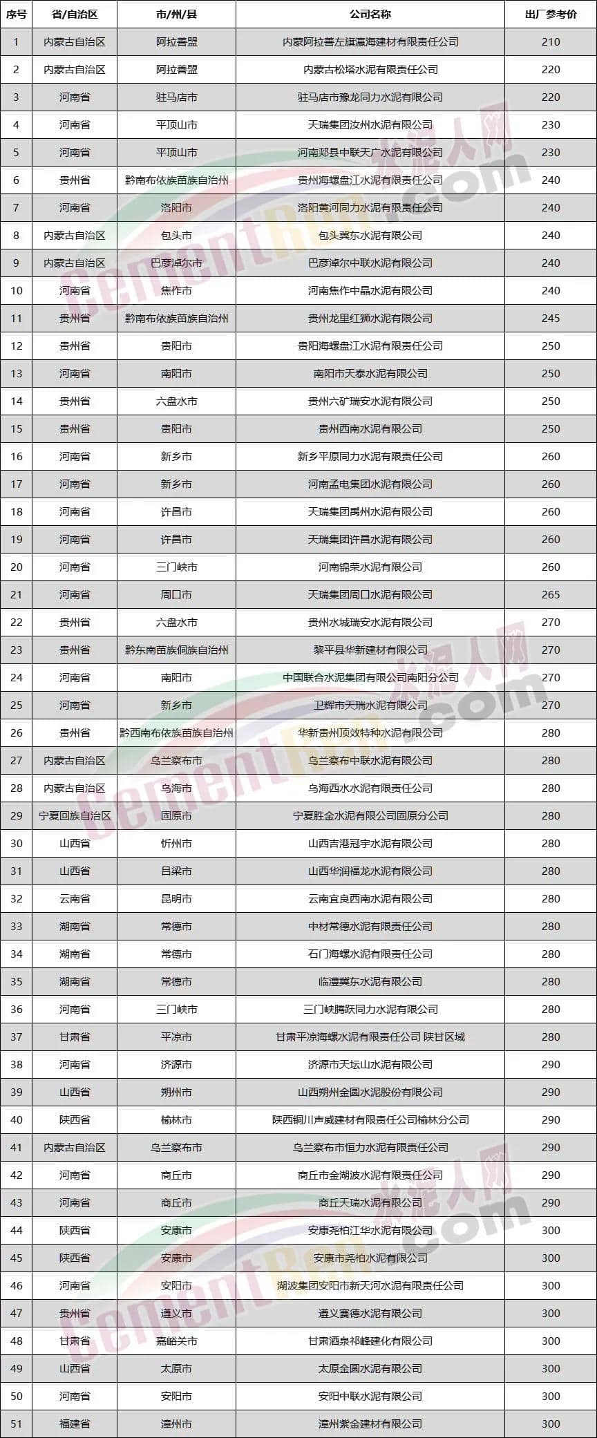 PO42.5散裝水泥報(bào)價(jià)(表二)