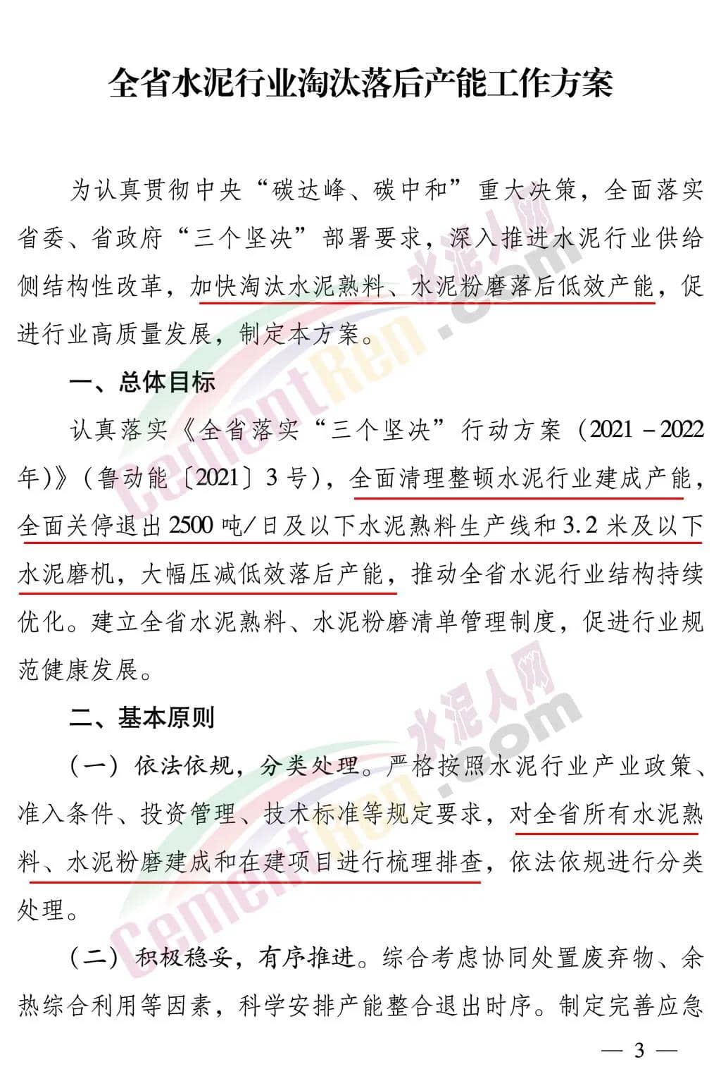 方案要求各市工業(yè)和信息化局、發(fā)展和改革委員會、自然資源局、生態(tài)環(huán)境局、市場監(jiān)督管理局認真落實《全省落實“三個堅決”行動方案(2021-2022年)》(魯動能〔2021〕3號),全面清理整頓水泥行業(yè)建成產能,全面關停退出2500噸/日及以下水泥熟料生產線和3.2米及以下水泥磨機,大幅壓減低效落后產能,推動全省水泥行業(yè)結構持續(xù)優(yōu)化。