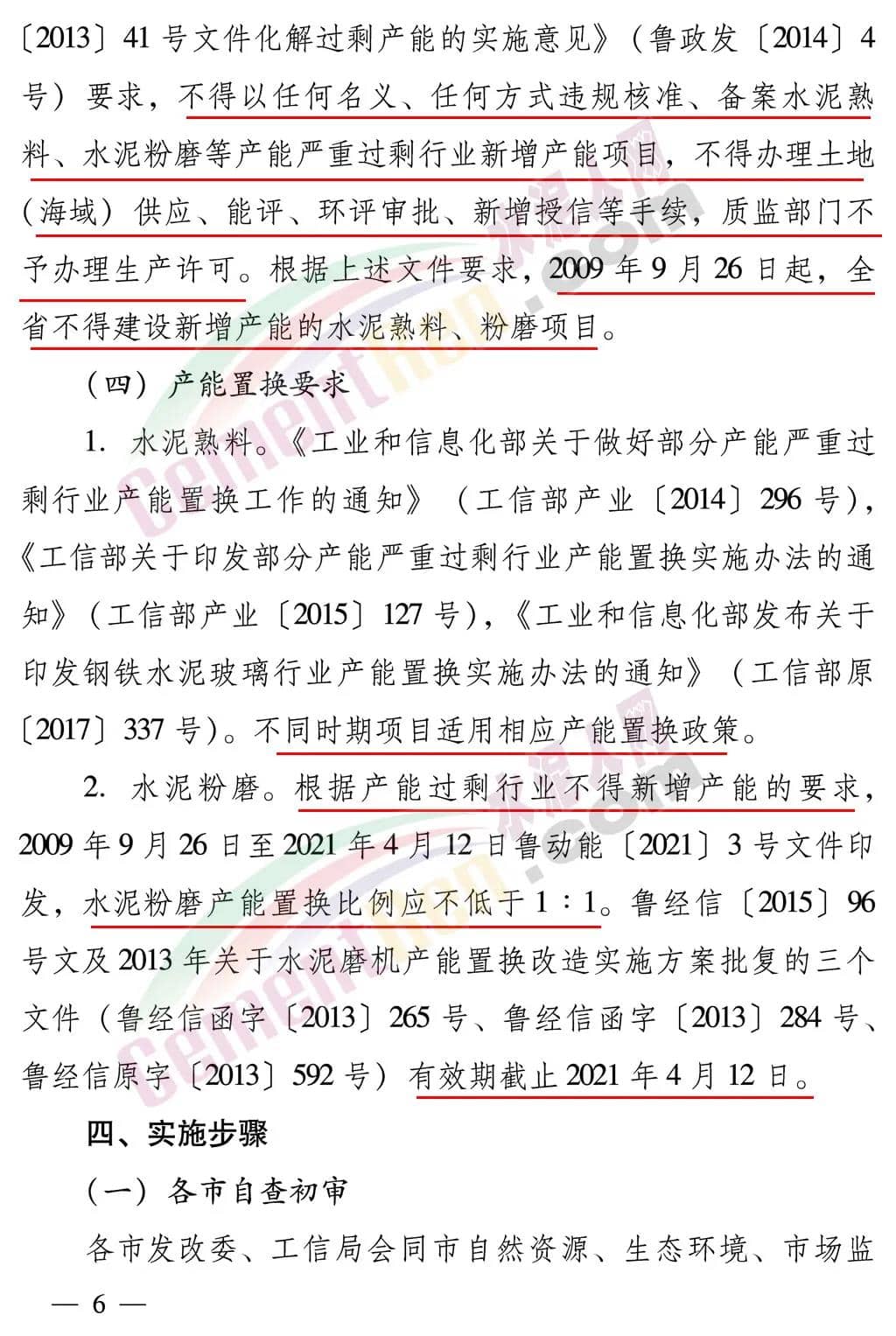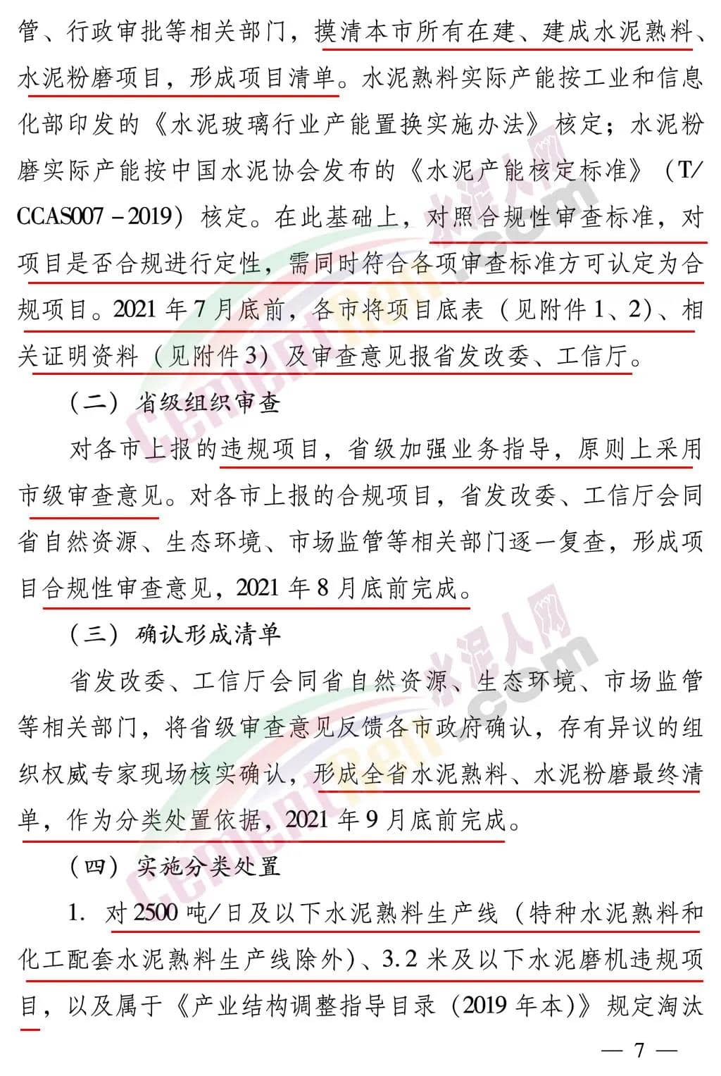 方案要求2021年7月底前,各市將項目底表、相關證明資料及審查意見報省發(fā)改委、工信廳;對各市上報的合規(guī)項目,省發(fā)改委、工信廳會同省自然資源、生態(tài)環(huán)境、市場監(jiān)管等相關部門逐一復查,形成項目合規(guī)性審查意見,2021年8月底前完成;省發(fā)改委、工信廳會同省自然資源、生態(tài)環(huán)境、市場監(jiān)管等相關部門,將省級審查意見反饋各市政府確認,存有異議的組織權威專家現(xiàn)場核實確認,形成全省水泥熟料、水泥粉磨最終清單,作為分類處置依據(jù),2021年9月底前完成。