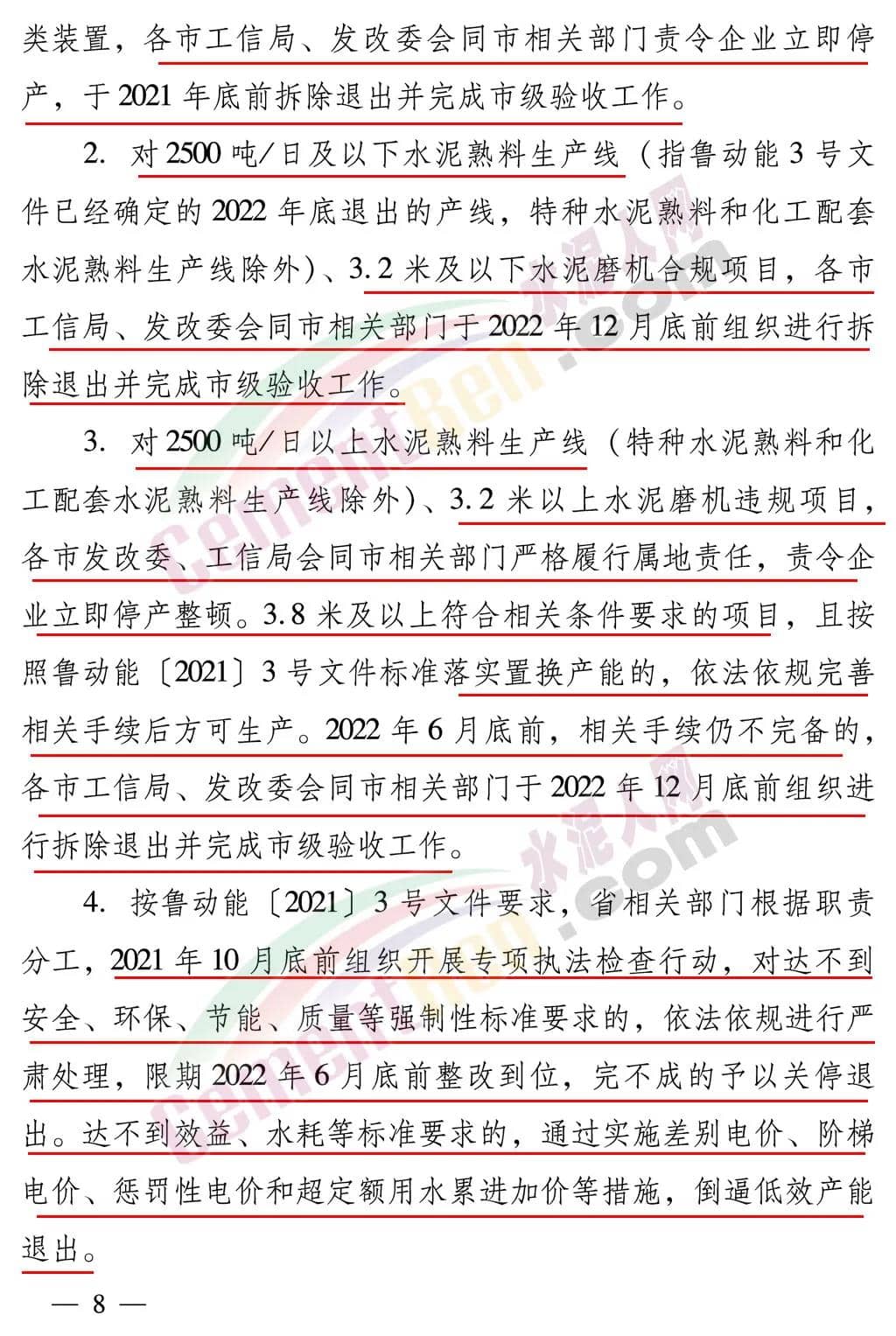 對2500噸/日及以下水泥熟料生產線(指魯動能3號文件已經確定的2022年底退出的產線,特種水泥熟料和化工配套水泥熟料生產線除外)、3.2米及以下水泥磨機合規(guī)項目,各市工信局、發(fā)改委會同市相關部門于2022年12月底前組織進行拆除退出并完成市級驗收工作。