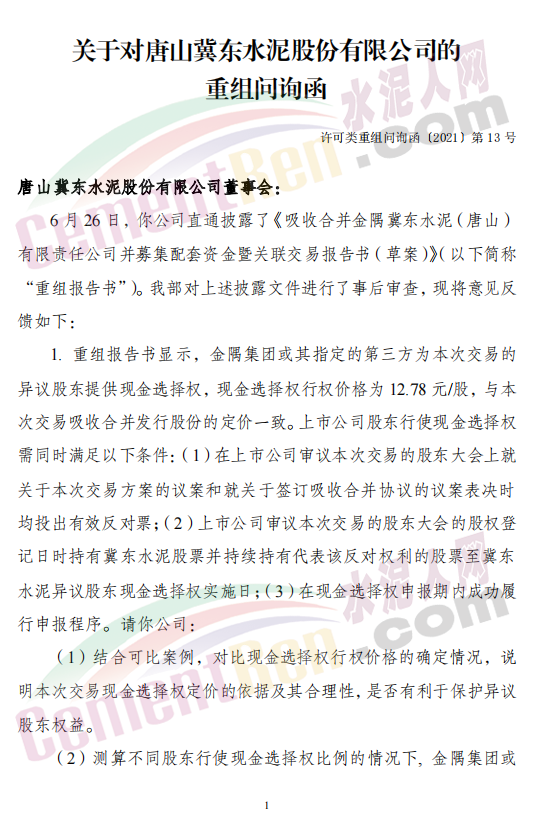 7月6日,冀東水泥上市公司收到深交所上市公司管理一部發(fā)來的《關于對唐山冀東水泥股份有限公司的重組問詢函》(以下簡稱“問詢函”)。問詢函提到6月26日,冀東水泥上市公司披露了《吸收合并金隅冀東水泥(唐山)有限責任公司并募集配套資金暨關聯交易報告書(草案)》。深交所要求公司結合可比案例,對比現金選擇權行權價格的確定情況,說明本次交易現金選擇權定價的依據及其合理性,是否有利于保護異議股東權益;測算不同股東行使現金選擇權比例的情況下,金隅集團或其指定的第三方需支付的現金及其履約能力,及冀東水泥公司在本次交易前后股權結構變化情況。