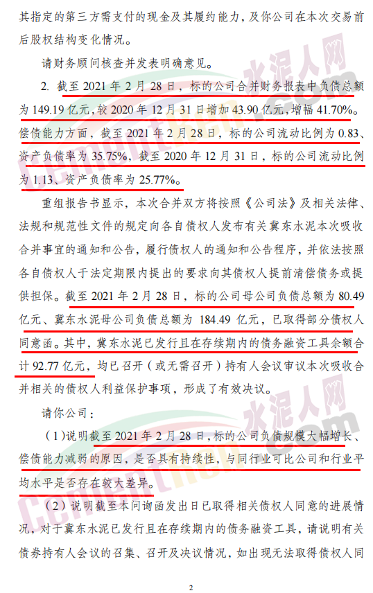 重組報告書顯示,本次合并雙方將按照《公司法》及相關法律、法規(guī)和規(guī)范性文件的規(guī)定向各自債權人發(fā)布有關冀東水泥本次吸收合并事宜的通知和公告,履行債權人的通知和公告程序,并依法按照各自債權人于法定期限內提出的要求向其債權人提前清償債務或提供擔保。截至2021年2月28日,標的公司母公司負債總額為80.49億元、冀東水泥母公司負債總額為184.49億元,已取得部分債權人同意函。其中,冀東水泥已發(fā)行且在存續(xù)期內的債務融資工具余額合計92.77億元,均已召開(或無需召開)持有人會議審議本次吸收合并相關的債權人利益保護事項,形成了有效決議。請公司: