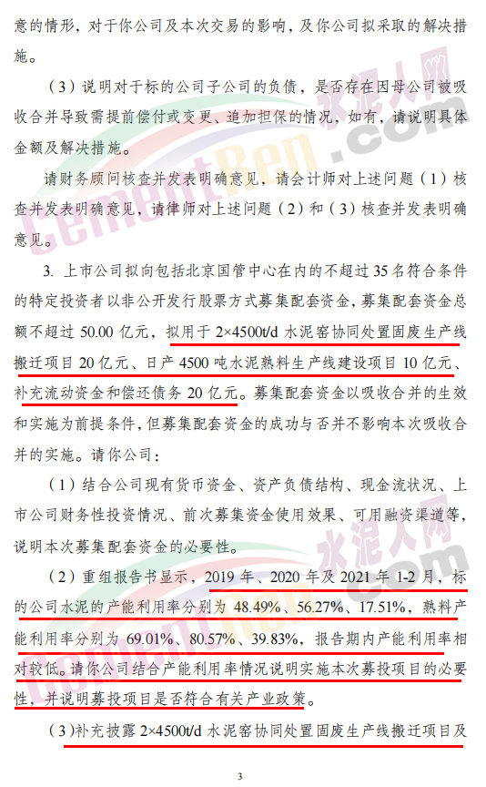 上市公司擬向包括北京國管中心在內的不超過35名符合條件的特定投資者以非公開發(fā)行股票方式募集配套資金,募集配套資金總額不超過50.00億元,擬用于2×4500t/d水泥窯協同處置固廢生產線搬遷項目20億元、日產4500噸水泥熟料生產線建設項目10億元、補充流動資金和償還債務20億元。募集配套資金以吸收合并的生效和實施為前提條件,但募集配套資金的成功與否并不影響本次吸收合并的實施。請公司: