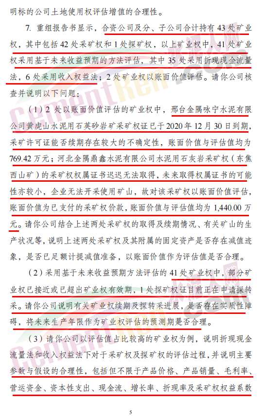 (1)兩處以賬面價值評估的礦業(yè)權中,邢臺金隅詠寧水泥有限公司黃虎山水泥用石英砂巖礦采礦權證已于2020年12月30日到期,采礦許可證能否續(xù)期存在較大的不確定性,賬面價值與評估值均為769.42萬元;河北金隅鼎鑫水泥有限公司水泥用石灰?guī)r采礦權(東焦西山礦)的采礦權權屬證書遲遲無法取得,未來取得權屬證書的可能性亦較小,企業(yè)無法開采使用礦山,故對該采礦權以賬面價值評估,賬面價值為已支付的采礦權價款,賬面價值與評估值均為1,440.00萬元。