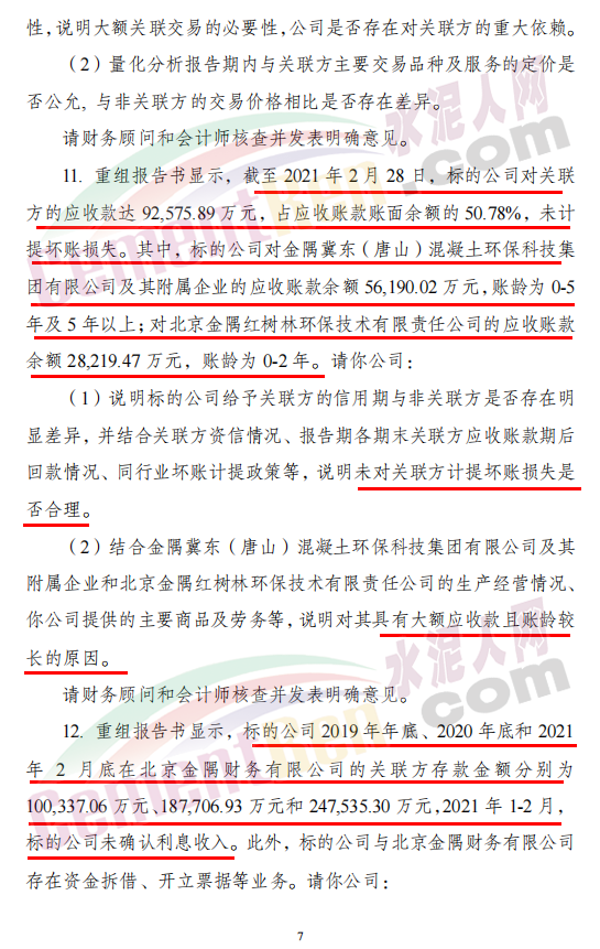 其中,標的公司對金隅冀東(唐山)混凝土環(huán)??萍技瘓F有限公司及其附屬企業(yè)的應收賬款余額56,190.02萬元,賬齡為0-5年及5年以上;對北京金隅紅樹林環(huán)保技術有限責任公司的應收賬款余額28,219.47萬元,賬齡為0-2年。請公司: