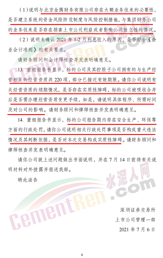 請公司就上述問題做出書面說明,并在7月14日前將有關說明材料對外披露并報送深交所上市公司管理一部。《關于對唐山冀東水泥股份有限公司的重組問詢函》全文如下: