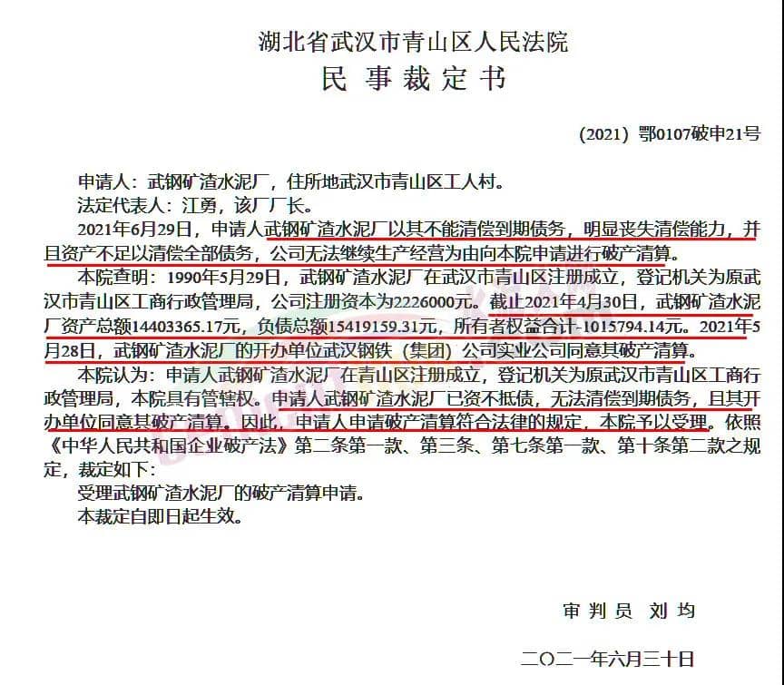 6月29日,申請(qǐng)人武鋼礦渣水泥廠以其不能清償?shù)狡趥鶆?wù),明顯喪失清償能力,并且資產(chǎn)不足以清償全部債務(wù),公司無(wú)法繼續(xù)生產(chǎn)經(jīng)營(yíng)為由向法院申請(qǐng)進(jìn)行破產(chǎn)清算。截止2021年4月30日,武鋼礦渣水泥廠資產(chǎn)總額約1440萬(wàn),負(fù)債總額約1542萬(wàn)元,所有者權(quán)益合計(jì)約-101.58萬(wàn)元。2021年5月28日,武鋼礦渣水泥廠的開(kāi)辦單位武漢鋼鐵(集團(tuán))公司實(shí)業(yè)公司同意其破產(chǎn)清算。