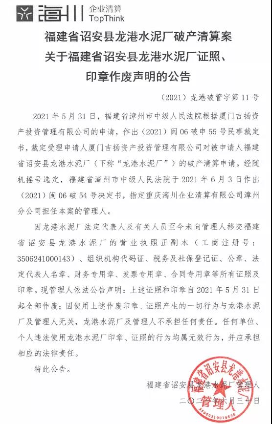 福建龍港水泥、江蘇運(yùn)通水泥破產(chǎn)清算,證照、印章作廢