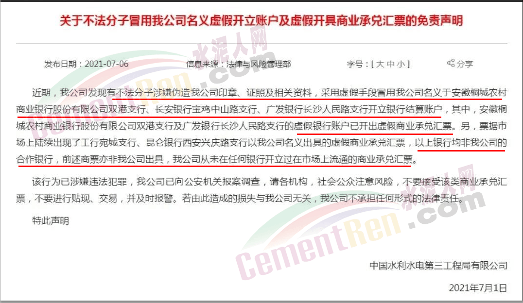 日前,中國(guó)水利水電第三工程局有限公司發(fā)布《關(guān)于不法分子冒用我公司名義虛假開立賬戶及虛假開具商業(yè)承兌匯票的免責(zé)聲明》稱,近期公司發(fā)現(xiàn)有不法分子涉嫌偽造中國(guó)水利水電第三工程局有限公司印章、證照及相關(guān)資料,采用虛假手段冒用中國(guó)水利水電第三工程局有限公司名義于開立銀行結(jié)算賬戶。并有部分虛假銀行賬戶已開出虛假商業(yè)承兌匯票。且公司從未在任何銀行開立過(guò)在市場(chǎng)上流通的商業(yè)承兌匯票。