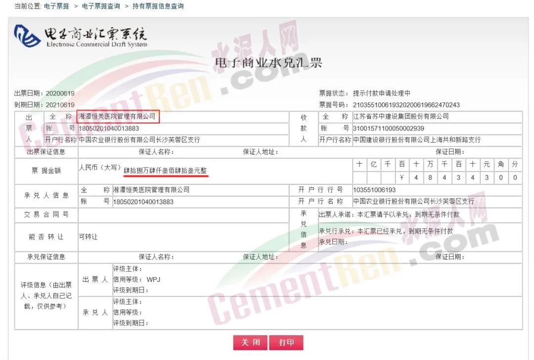 2021年6月19日,湘潭恒美醫(yī)院管理有限公司向江蘇省蘇中建設(shè)集團(tuán)股份有限公司開出的一張一年期48.4萬(wàn)元商業(yè)承兌匯票到期,債務(wù)人仍未付款,票據(jù)被申請(qǐng)付款處理中。