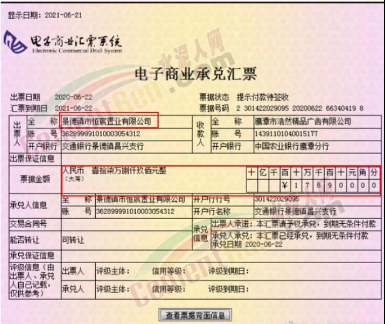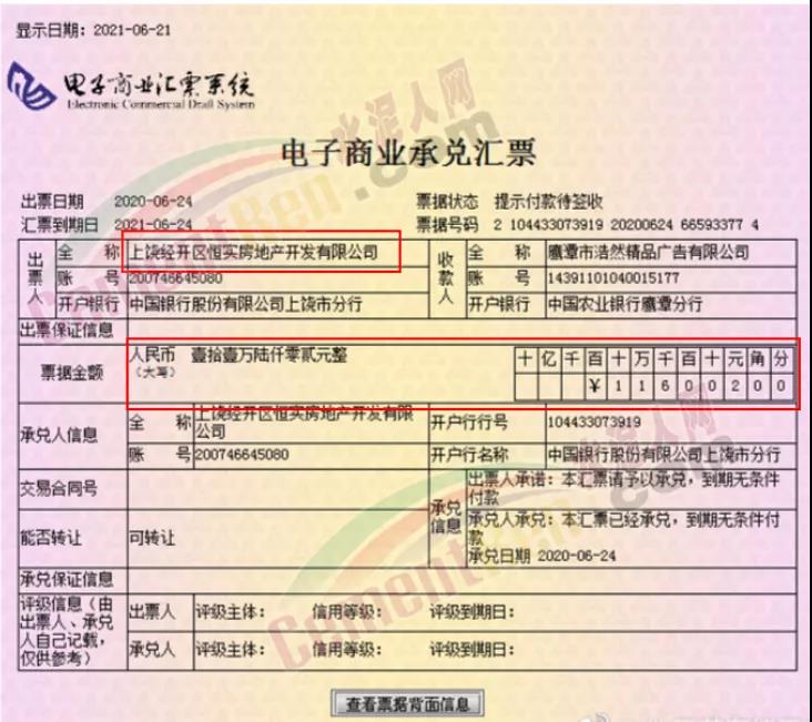 2021年6月22日,由江西恒大地產(chǎn)簽發(fā)的商業(yè)承兌匯票多張到期不兌付,景德鎮(zhèn)市恒宸置業(yè)、景德鎮(zhèn)德泰房地產(chǎn)、上海經(jīng)開區(qū)恒實(shí)房地產(chǎn)均存在未兌付票據(jù)共計(jì)46.3萬(wàn)元,商戶愿意接受恒大的票據(jù)是對(duì)恒大的信任,然而事實(shí)卻是這份難得的信任也遭到了踐踏。