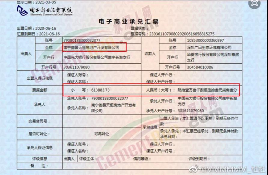 內(nèi)部員工:“本公司持有多張恒大商業(yè)承兌匯票,已經(jīng)嚴(yán)重逾期了,我司與恒大負(fù)責(zé)兌付的人員多次協(xié)商,前面承諾2021年6月10日前將5月份到期的票據(jù)兌付完畢,現(xiàn)到期后,還以各種理由推脫,回款遙遙無(wú)期。6月16日到期的也同樣未得到回復(fù)。”