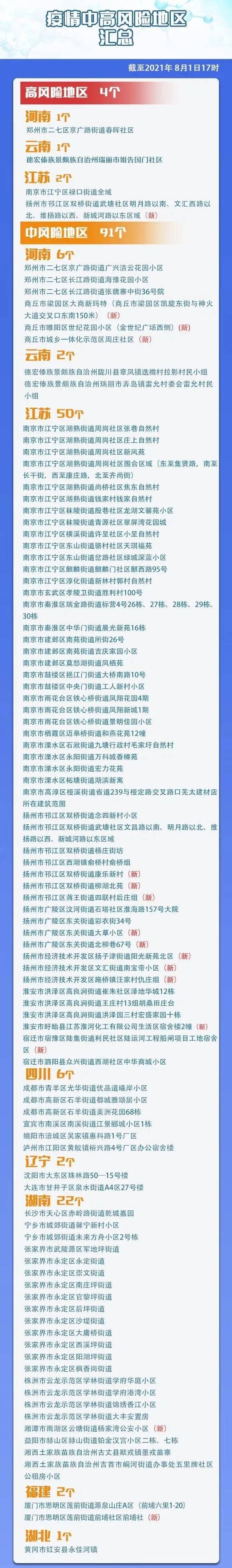 據(jù)人民網(wǎng)消息,自8月1日起,江蘇揚(yáng)州1個(gè)地區(qū)調(diào)整為高風(fēng)險(xiǎn),8個(gè)地區(qū)調(diào)整為中風(fēng)險(xiǎn)。截至8月1日17時(shí),全國(guó)有4個(gè)高風(fēng)險(xiǎn)地區(qū),91個(gè)中風(fēng)險(xiǎn)地區(qū)。