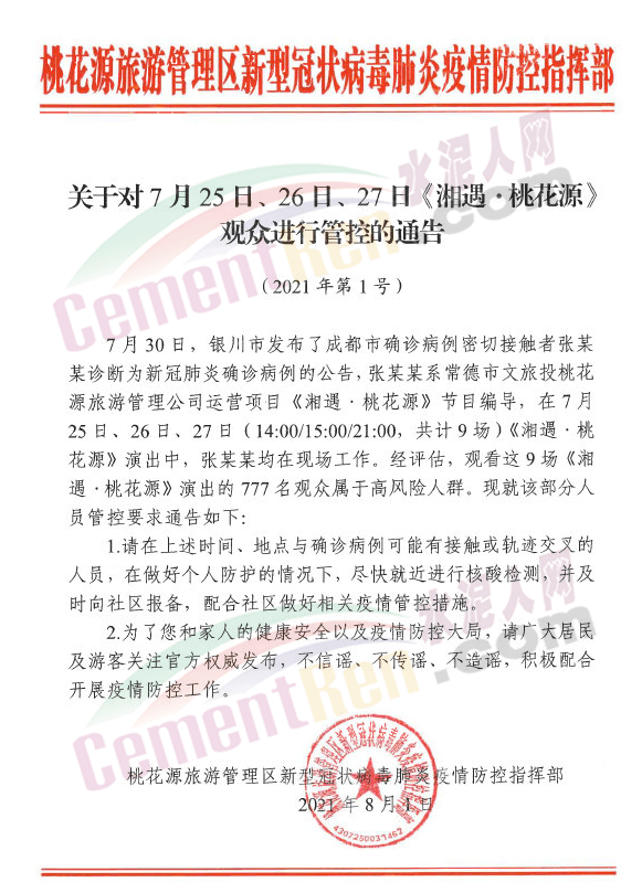 同日,湖南常德市桃花源旅游管理區(qū)新型冠狀病毒肺炎疫情防控指揮部發(fā)布消息稱,在7月25日、26日、27日觀看9場(chǎng)《湘遇·桃花源》演出的777名觀眾屬于高風(fēng)險(xiǎn)人群。