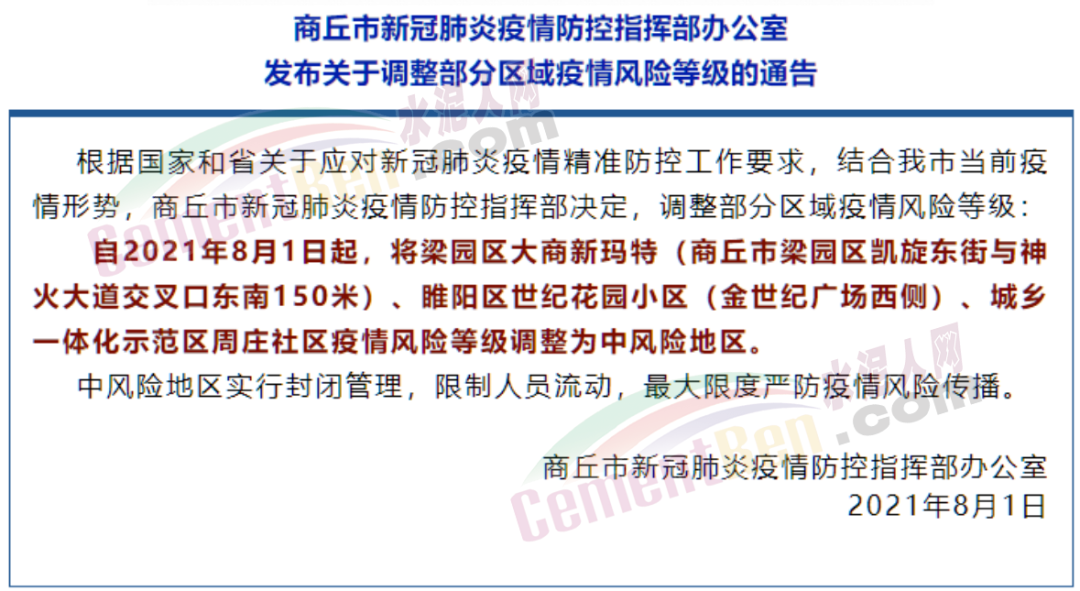 河南商丘市新冠肺炎疫情防控指揮部辦公室發(fā)布《商丘市新冠肺炎疫情防控指揮部辦公室發(fā)布關(guān)于調(diào)整部分區(qū)域疫情風(fēng)險(xiǎn)等級(jí)的通告》稱,自8月1日起,將梁園區(qū)大商新瑪特(商丘市梁園區(qū)凱旋東街與神火大道交叉口東南150米)、睢陽(yáng)區(qū)世紀(jì)花園小區(qū)(金世紀(jì)廣場(chǎng)西側(cè))、城鄉(xiāng)一體化示范區(qū)周莊社區(qū)疫情風(fēng)險(xiǎn)等級(jí)調(diào)整為中風(fēng)險(xiǎn)地區(qū)。中風(fēng)險(xiǎn)地區(qū)實(shí)行封閉管理,限制人員流動(dòng),最大限度嚴(yán)防疫情風(fēng)險(xiǎn)傳播。