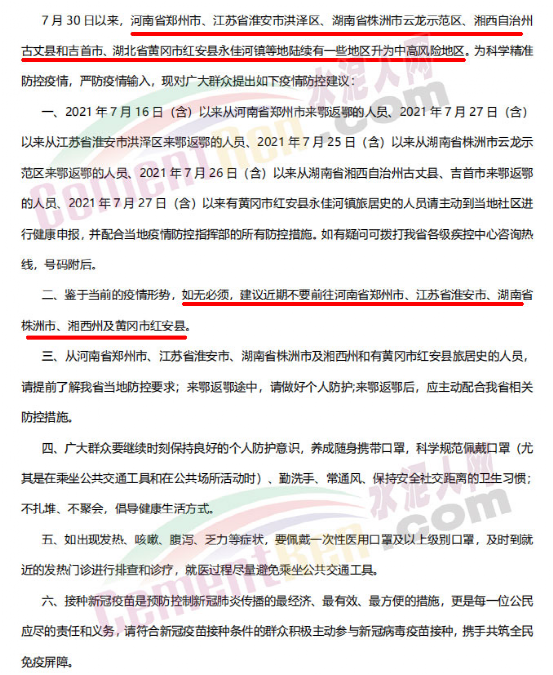 7月31日,湖北疾控連續(xù)發(fā)出多個(gè)緊急提示,鑒于當(dāng)前的疫情形勢(shì),如無(wú)必須,建議近期不要前往河南省鄭州市、江蘇省淮安市、湖南省株洲市、湘西州及黃岡市紅安縣。