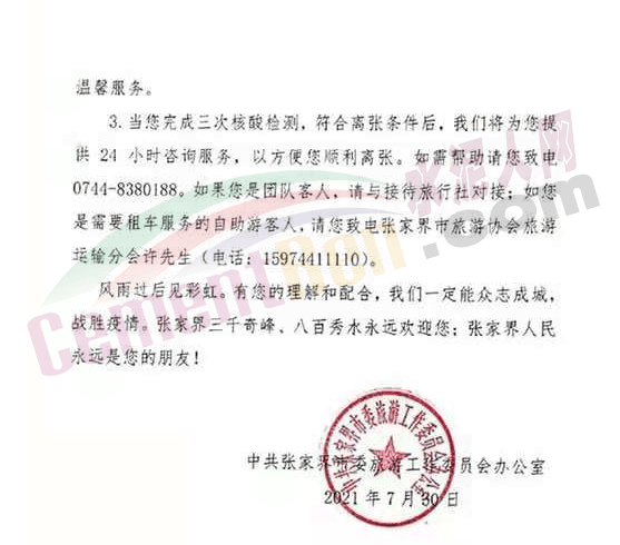 7月30日,湖南省張家界發(fā)布《致居留在張家界游客朋友的一封信》,稱根據(jù)聯(lián)防聯(lián)控機(jī)制相關(guān)要求,張家界兩個(gè)區(qū)11個(gè)街道調(diào)整為中風(fēng)險(xiǎn)地區(qū)。全市所有景區(qū)景點(diǎn)于今天全部關(guān)閉,提示游客在離開張家界之前配合完成三次核酸檢測(cè)。