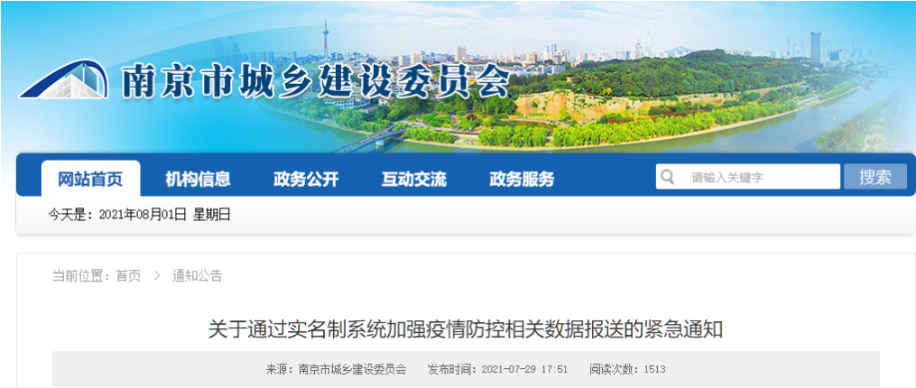 江蘇南京市城鄉(xiāng)建設(shè)委員會(huì)發(fā)布《關(guān)于通過實(shí)名制系統(tǒng)加強(qiáng)疫情防控相關(guān)數(shù)據(jù)報(bào)送的緊急通知。