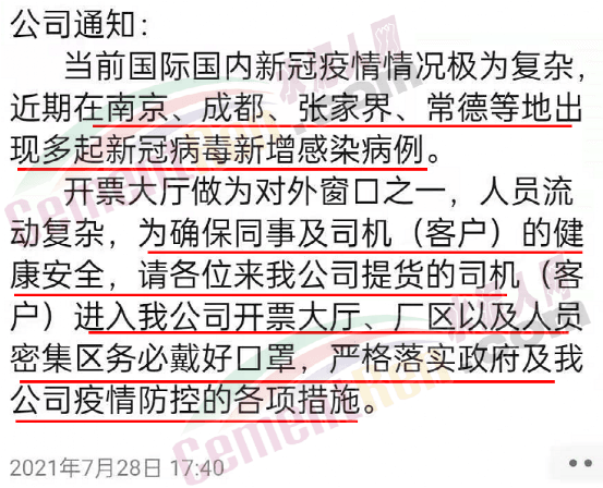 據(jù)水泥人網(wǎng)了解,企業(yè)近兩日連續(xù)發(fā)布提示通知,提示車輛進(jìn)入石門境內(nèi)路口設(shè)有卡口,來往人員經(jīng)過卡口需提供出發(fā)地核酸檢驗(yàn)證明、健康綠碼、行程碼并接受體溫檢測。同時(shí)進(jìn)入開票大廳的所有司機(jī)(客戶)必須正確佩戴口罩,主動(dòng)出示健康碼,行程碼,綠色才能開票。