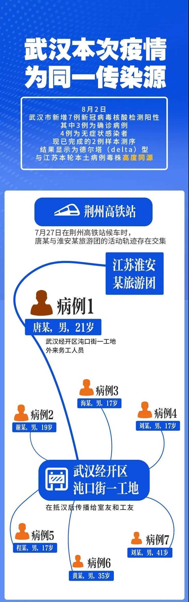 2021年8月1日晚,武漢經(jīng)開區(qū)對江蘇淮安某旅游團途經(jīng)的重點區(qū)域駐留人員進行了排查,發(fā)現(xiàn)沌口街一工地外來務工人員唐某,曾于7月27日在荊州高鐵站候車時,與淮安某旅游團的活動軌跡存在交集。該區(qū)立即對其進行新冠病毒核酸檢測,8月2日上午,唐某檢測結(jié)果顯示為陽性。
