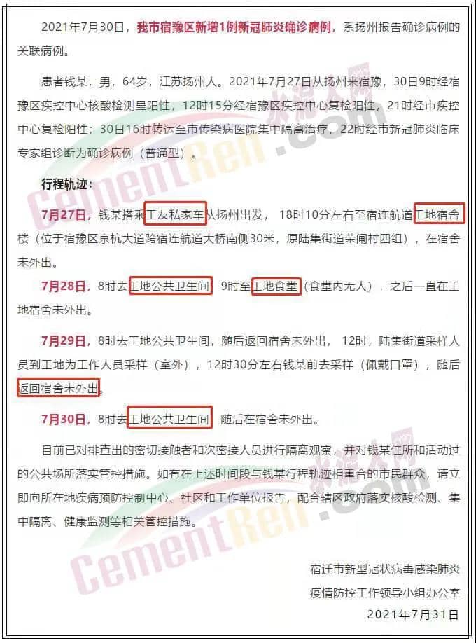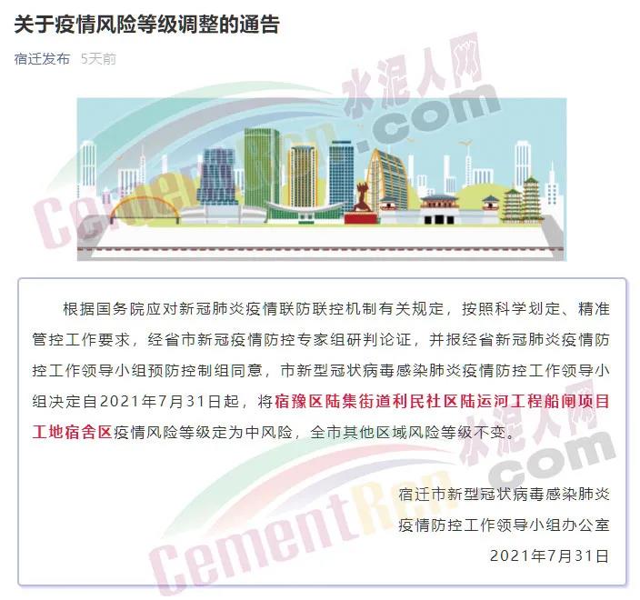 7月30日,江蘇宿遷一工地宿舍確診1例新冠肺炎病例,7月31日,將該宿舍區(qū)疫情風險等級定為中風險。