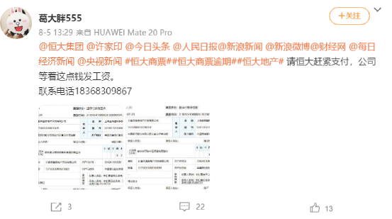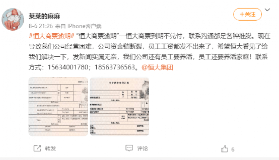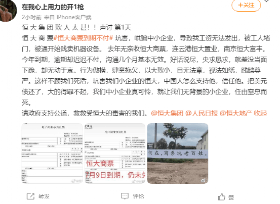 有網(wǎng)友在社交平臺上留言稱,恒大商票到期未付,令企業(yè)工資無法發(fā)出,被工人堵門,被逼賤賣機器設(shè)備。去年無奈收恒大商票,連云港恒大置業(yè),南京恒大富豐。今年到期,逾期卻遲遲不付,溝通幾個月基本無效。
