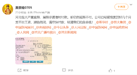 另一網(wǎng)友提到,“河北恒大嚴(yán)重逾期,展期承諾準(zhǔn)時付款,卻仍然延期不付,公司已經(jīng)被拖累好幾個月發(fā)不出工資,瀕臨倒閉。”