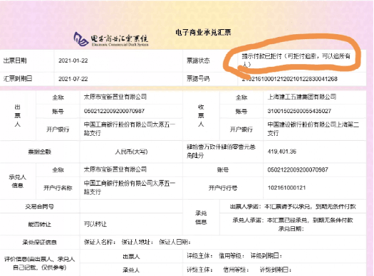 同時,其還曬出了兩份商業(yè)承兌匯票的截圖,金額分別為40多萬和10多萬,出票人均顯示為太原市寶鉅置業(yè)有限公司,出票時間為2021年1月22日,到期日為2021年7月22日。票據(jù)狀態(tài)為“提示付款已拒付”。