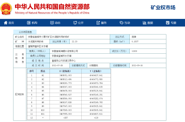 7月26日安徽宣城海螺水泥有限公司以12200萬元成交價中標(biāo)安徽省宣城市小葛村礦區(qū)水泥配料用砂巖礦0.1837km²采礦權(quán)22.2年。