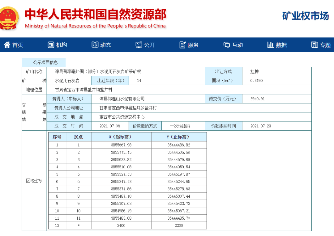 7月6日,漳縣祁連山水泥有限公司(甘肅祁連山水泥集團(tuán)股份有限公司)成功競得漳縣茍家寨外圍(部分)水泥用石灰?guī)r礦采礦權(quán),成交價格為3940.91萬元。該礦山位于甘肅省定西市漳縣鹽井鎮(zhèn)鹽井村,資源儲量達(dá)5103.16萬噸,擬出讓14年。