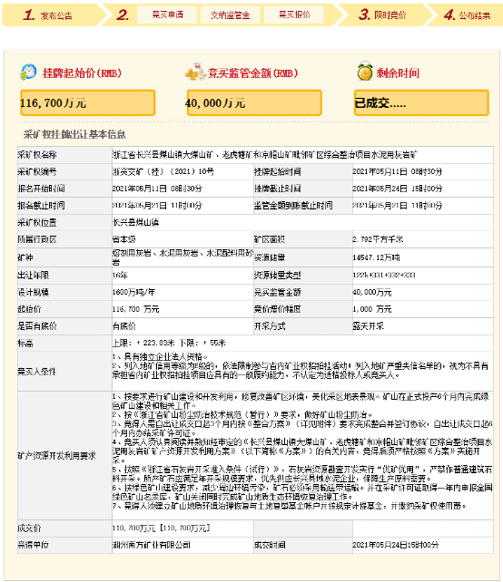 5月24日,湖州南方礦業(yè)有限公司以118700萬元成功中標(biāo)浙江省湖州市長興縣大煤山礦、老虎塘礦和涼帽山礦毗鄰礦區(qū)綜合整治項(xiàng)目水泥用灰?guī)r采礦權(quán)(三礦整合)。