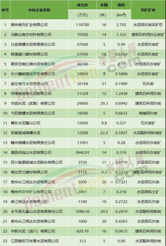 綜合此前水泥人網(wǎng)報(bào)道國內(nèi)多家龍頭企業(yè)均有在今年內(nèi)拿到要采礦權(quán)。其中華潤水泥(武宣)有限公司以16060萬元競得廣西武宣縣石疊礦區(qū)水泥用石灰?guī)r礦29.3年采礦權(quán);競得面積相對較大的是湖州南方礦業(yè)有限公司競得的“三合一”礦山,即浙江省湖州市長興縣大煤山礦、老虎塘礦和涼帽山礦毗鄰礦區(qū)。三礦合一后總面積達(dá)到2.792km²,其成交金額高達(dá)到11.87億元。