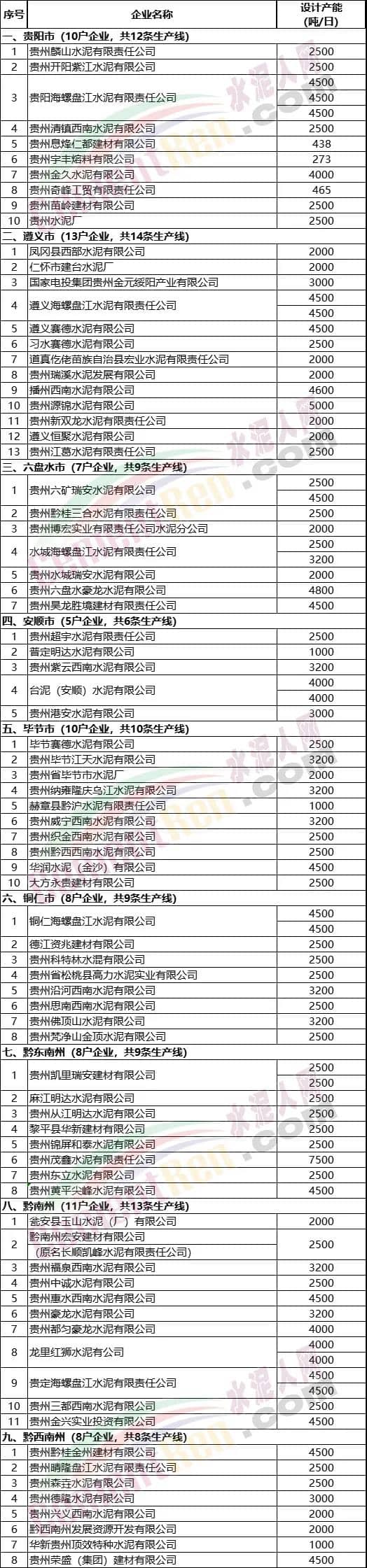 貴州省水泥熟料生產(chǎn)線(xiàn)清單