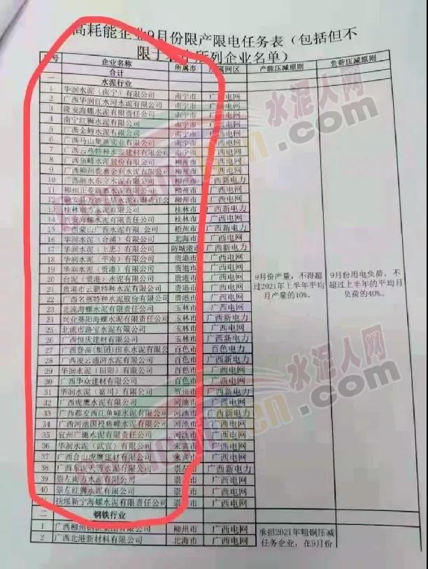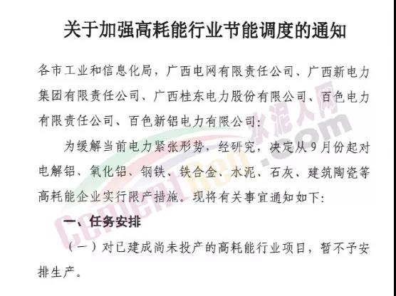 日前,廣西壯族自治區(qū)工信廳發(fā)布《關(guān)于加強高耗能行業(yè)節(jié)能調(diào)度的通知》給各市工業(yè)和信息化局,廣西電網(wǎng)有限責任公司、廣西新電力集團有限責任公司、廣西桂東電力股份有限公司、百色電力有限責任公司、百色新鋁電力有限公司稱,為緩解當前電力緊張形勢,決定從9月份起對電解鋁、氧化鋁、鋼鐵、鐵合金、水泥、石灰、建筑陶瓷等高耗能企業(yè)實行限產(chǎn)措施。