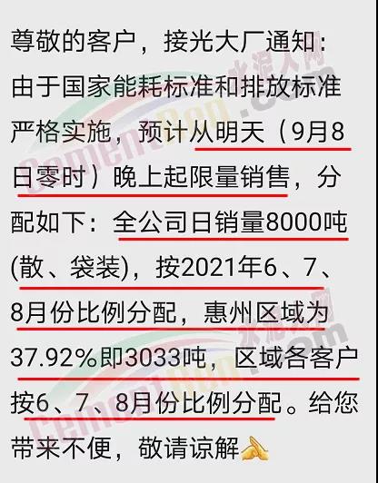 9月7日光大水泥廠通知:由于國家能耗標準和排放標準嚴格實施,預計從今日(9月8日)零時起限量銷售:全公司日銷量8000噸(散、袋裝),按2021年6、7、8月份比例分配,惠州區(qū)域為37.92%即3033噸,區(qū)域各客戶按6、7、8月份比例分配。