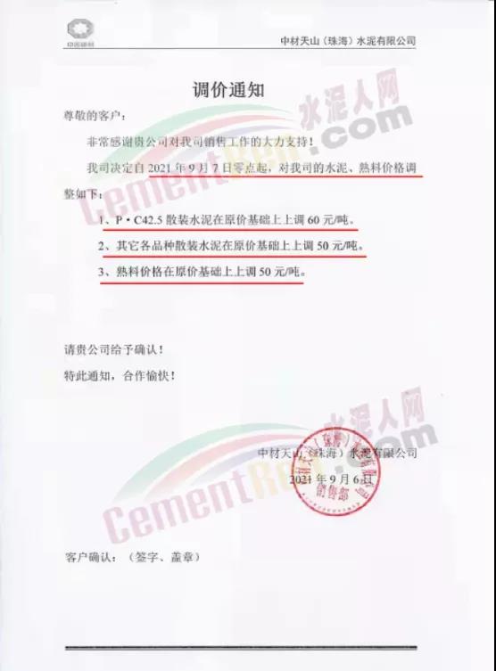 9月7日中材天山(珠海)水泥有限公司對水泥、熟料價格上調(diào)50-60元/噸。