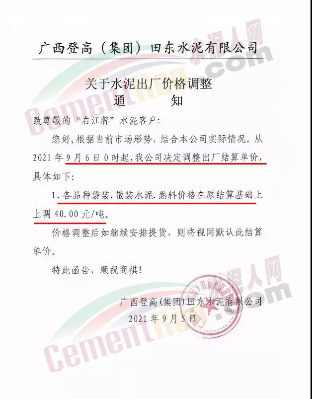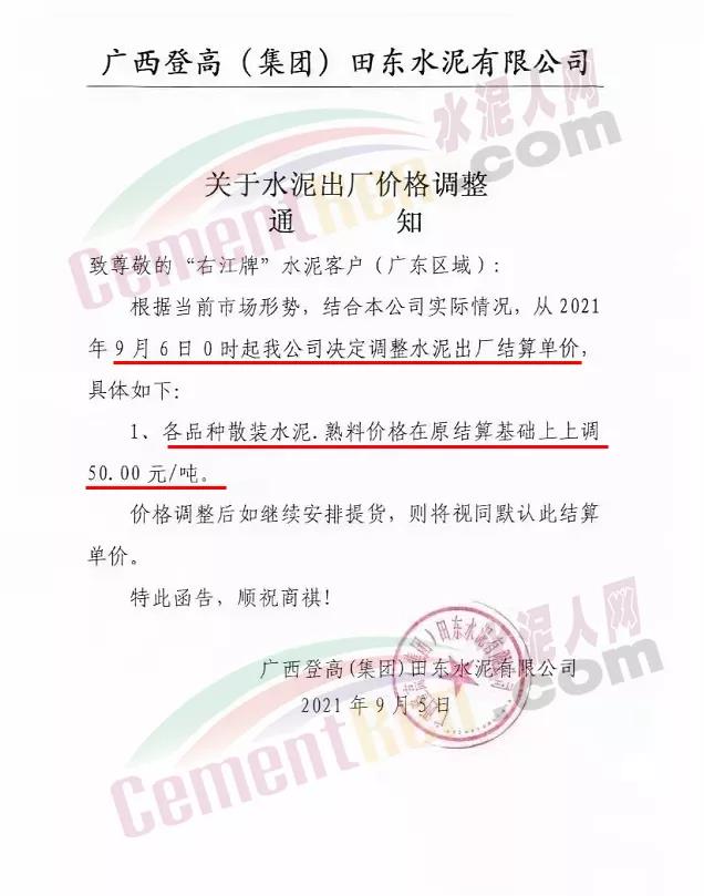 9月5日廣西華宏建材有限公司對各品種水泥價格上調(diào)50元/噸。