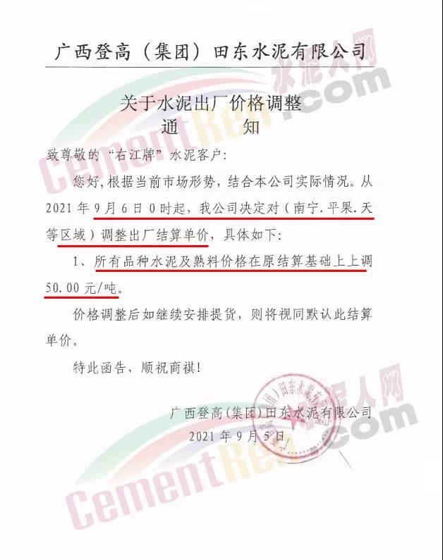 9月5日華潤水泥對發(fā)往南寧北區(qū)域以及平南方向各品種水泥價格上調(diào)50元/噸。