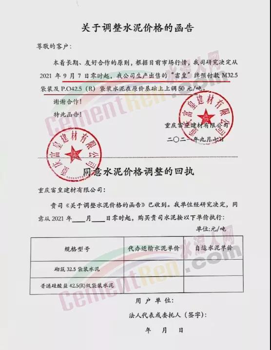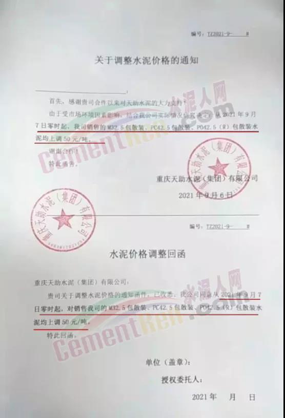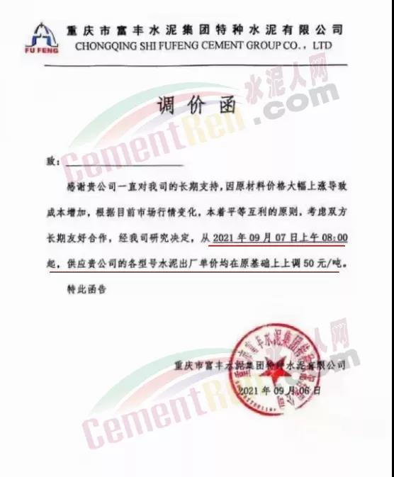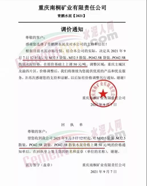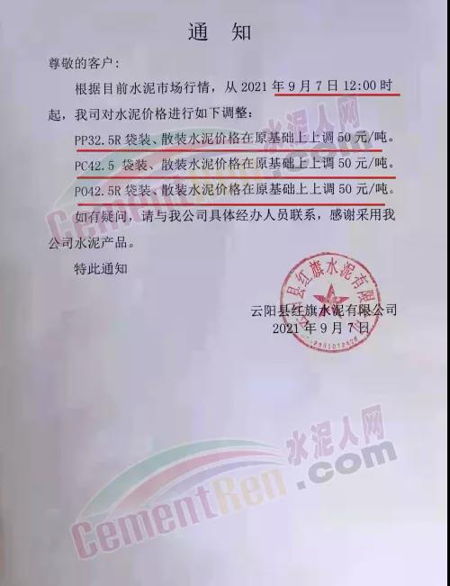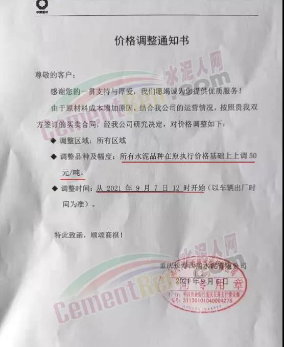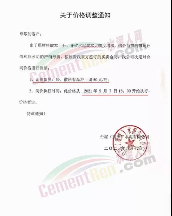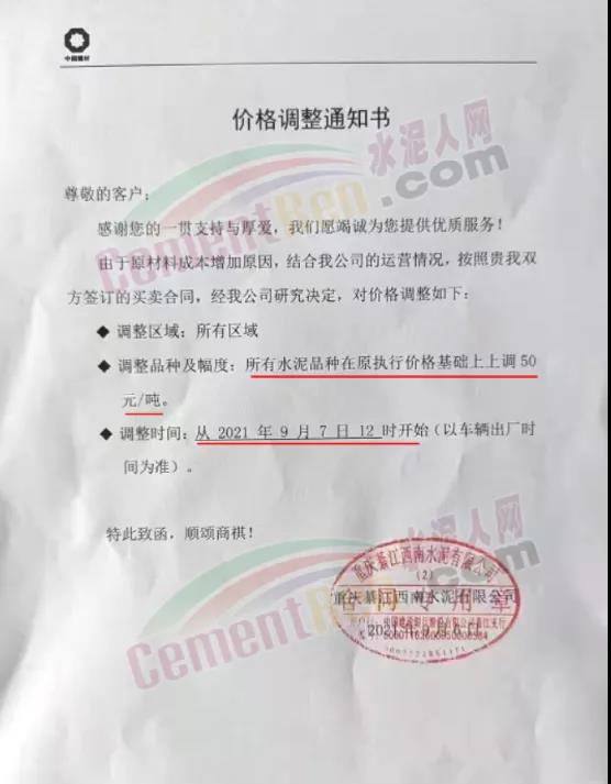 9月7日重慶綦江西南水泥、長壽西南水泥、臺泥重慶公司等9家企業(yè)通知上調(diào)各標號水泥價格50元/噸