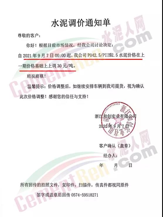 9月7日華東區(qū)域貿(mào)易商浙江和創(chuàng)實業(yè)有限公司通知PO42.5和PII52.5水泥上調(diào)30元/噸。