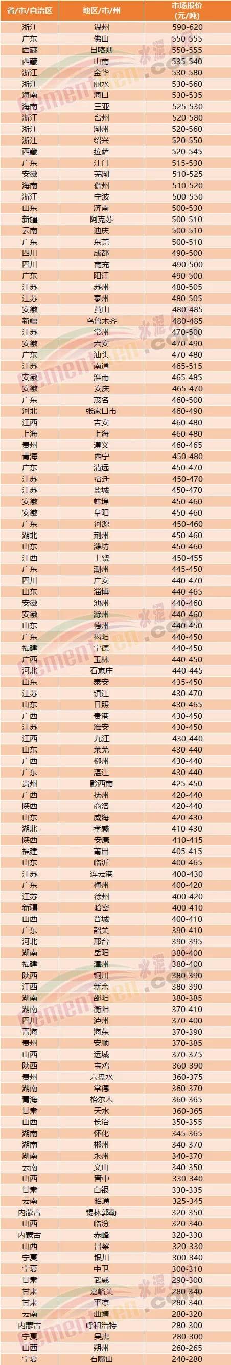 水泥人網(wǎng)信息中心數(shù)據(jù)顯示,水泥價格經(jīng)過本輪調(diào)整,各區(qū)域水泥價格均出現(xiàn)不同幅度的上漲,其中浙江溫州部分地區(qū)PO42.5散裝水泥到位價已達620元/噸。浙江麗水、金華、臺州、湖州、紹興等多區(qū)域PO42.5散裝水泥到位價已達550元/噸以上。廣東佛山地區(qū)PO42.5散裝水泥到位價已達555元/噸。