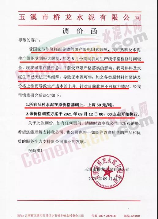 玉溪市橋龍水泥有限公司通知,受國家節(jié)能降耗而導(dǎo)致的限產(chǎn)限電因素影響,公司熟料及水泥生產(chǎn)組織受到極大限制,加之8月份期間公司生產(chǎn)線停窯檢修時間較長,現(xiàn)公司庫存量告急。目前受雙限嚴格落實的影響,公司熟料及水泥生產(chǎn)已無法正常組織,導(dǎo)致無水泥可售;加之各類原材料的緊缺及價格上漲而導(dǎo)致生產(chǎn)成本的上升,針對目前此種不可抗力情況,公司于2021年9月12日0點起開始上調(diào)所有品種水泥價格50元/噸。