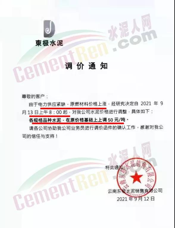 云南東極水泥通知由于電力供應(yīng)緊缺,原材料價格上漲自9月13日上午8時起上調(diào)各規(guī)格品種水泥50元/噸。