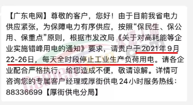 9月22日,東莞某企業(yè)收到廣東電網(wǎng)東莞供電局厚街供電分局的一則短信通知,“由于目前我省電力供應(yīng)緊張,為保障電力有序供應(yīng),按照‘保民生、保公用、保重點(diǎn)’原則,根據(jù)市發(fā)改局《關(guān)于對(duì)高耗能等企業(yè)實(shí)施錯(cuò)峰用電的通知》要求,請(qǐng)貴戶于2021年9月22-26日,每天全時(shí)段停止工業(yè)生產(chǎn)負(fù)荷用電。”