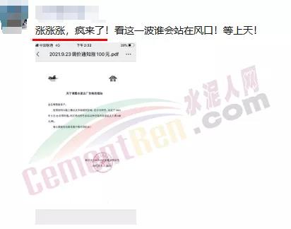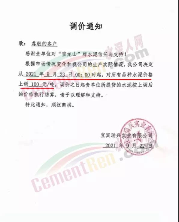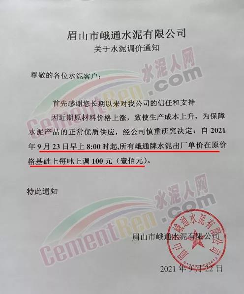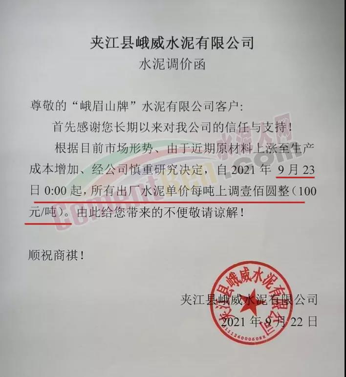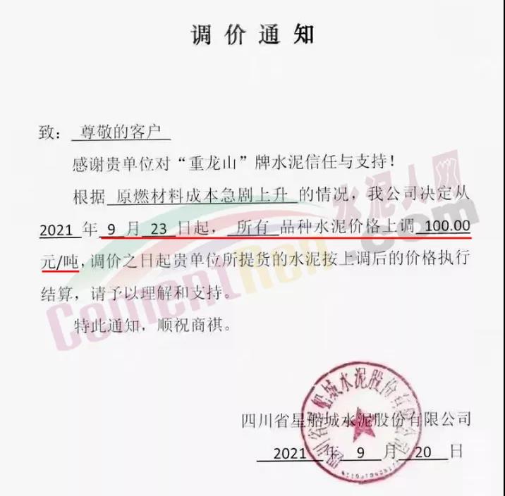 四川省星船城水泥股份有限公司通知根據(jù)原燃材料成本急劇上升的情況,公司決定從2021年9月23日起,所有品種水泥價(jià)格上調(diào)100元/噸。