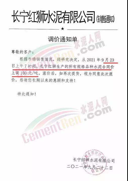 長(zhǎng)寧紅獅水泥通知自9月23日上午7時(shí)起,所有品種水泥合同價(jià)上調(diào)100元/噸。